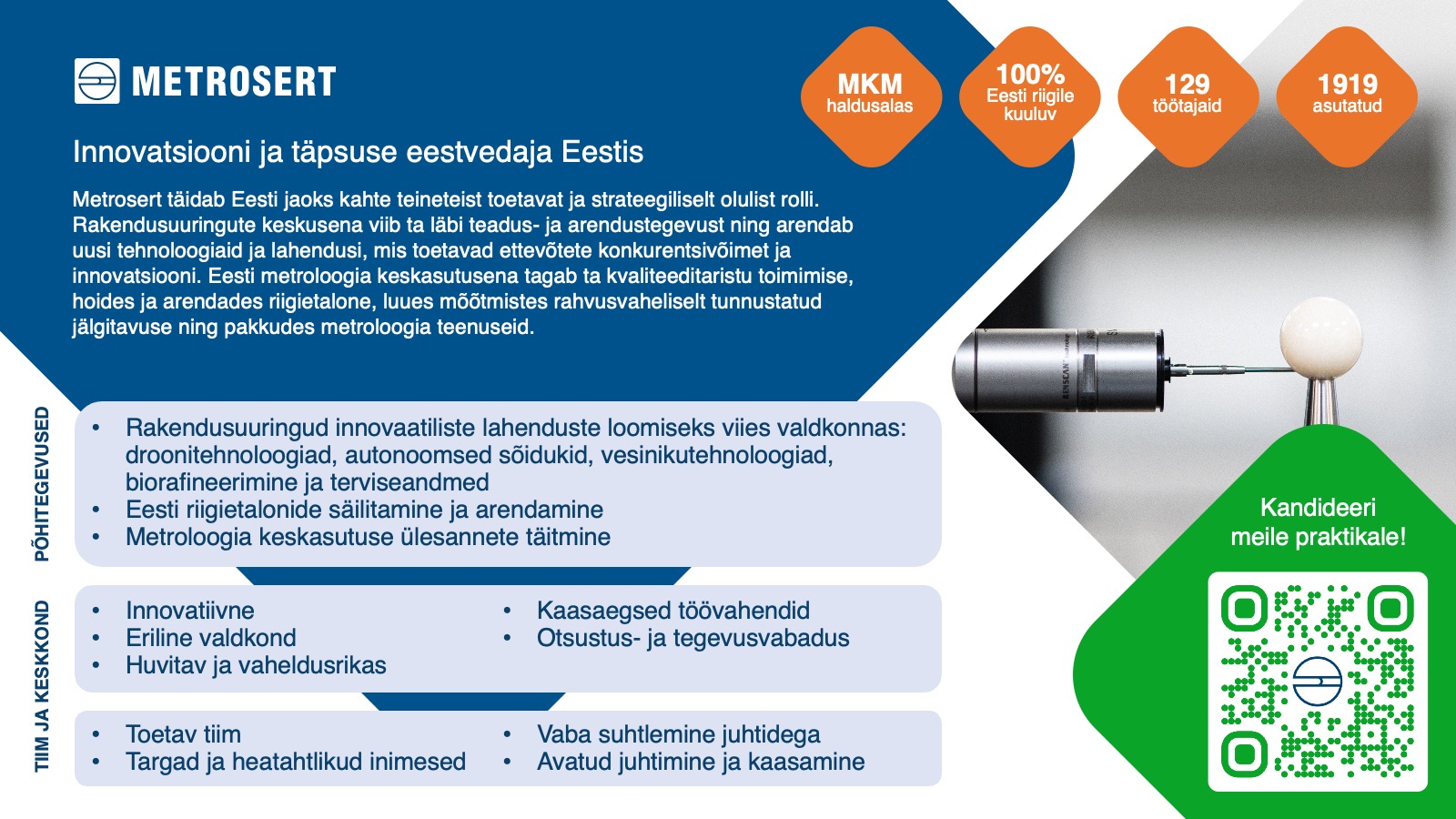 Metroserti esindasid meie inimeste ja töökultuuri juht Helina Pajussaar ja personalispetsialist Berit Pärt, kes tutvustasid praktika- ja karjäärivõimalusi Metroserdis ning rääkisid lähemalt, milliste põnevate projektidega igapäevaselt tegeleme. Samuti vastasid nad tudengite küsimustele ja avasid, kuidas näeb välja igapäevane töö rakendusuuringute ja mõõteteaduste valdkonnas.